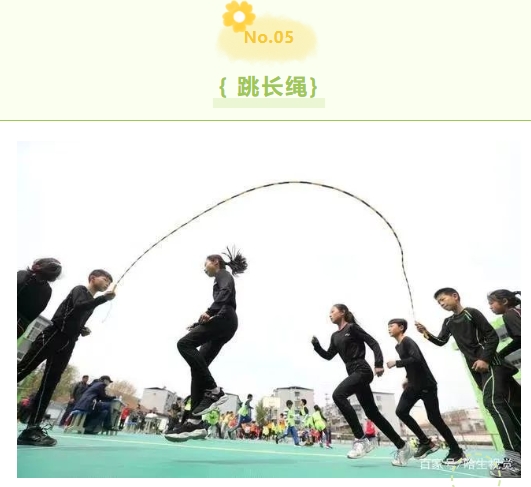【活动规则】: 队员要从绳子的一边按顺序依次连续跳,绳子中间必须保留1人,即第1人进绳后跳1次后出绳,第2人等第1人跳第1次后立即进绳,以后按序进行。跳过绳子后回到起点,绳子绕过身体一圈记1个。如果跳绳者不能通过绳子,返回继续进行。所有队员都穿越后,再依次进入下一轮跳绳。以3分钟内通过人数多者获胜。若两队最终成绩一样,则看失误的次数,失误次数少的队成绩领先,如仍相等,则加赛一次2分钟跳长绳。