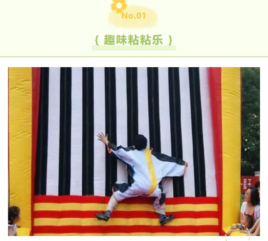 【活动规则】:穿好魔术贴衣服的运动员在助跑垫上准备,听到裁判开始的口令都,随意助跑,起跳,使自己紧紧贴在墙上,越高成绩越好,从身体的最低部位到助跑垫的高度是此运动员的成绩,高度高着名次列前。