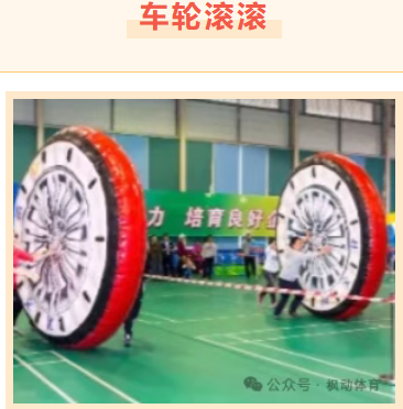 活动玩法:队员相互配合把车轮推向终点,终点队员再以相同的方式返回起点;车轮倒地一次加时5秒,过度偏离赛道加时5秒,当车轮触及到起点线所在垂直平面,计时停止,用时短者名次列前。
