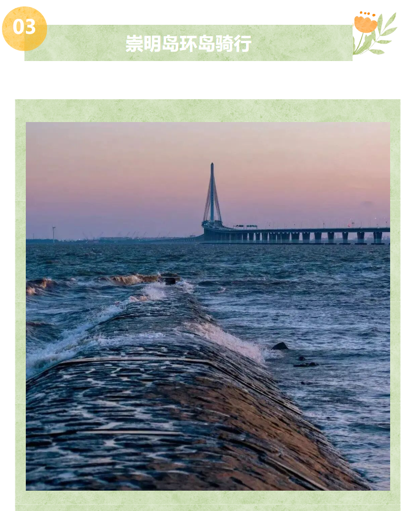• 路线:崇明环岛景观道,可选择10-50公里分段骑行。