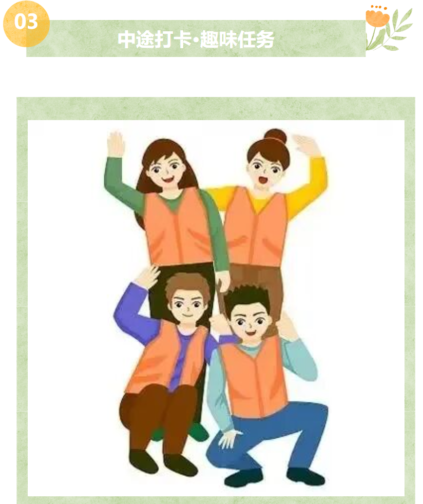 在沿途设置打卡点、拍照任务、团队小游戏:
