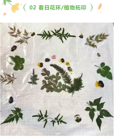 收集春日花草,制作清新的春日花环。或用植物拓印,把春天的色彩永久定格在帆布包、纸张上,亲近自然,培养审美,成品可直接带回家做装饰。