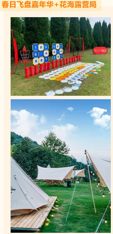 当下最火的轻运动团建,新手零门槛轻松上手!在漫山花海、青青草坪上,开展飞盘九宫格、飞盘投篮、团队飞盘赛,阳光微风相伴,无激烈对抗,全员快乐运动。运动过后开启轻奢露营,围炉煮茶、春日野餐、星空小聚,治愈职场疲惫,松弛感拉满,随手一拍就是ins风大片。