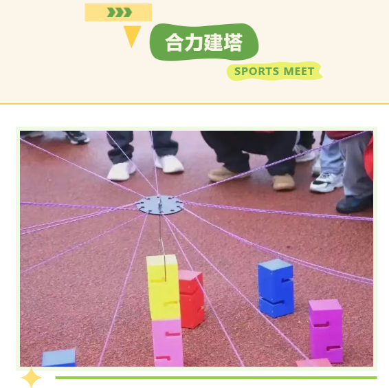 • 每队4-6人,每人手持一根绳索,共同操控搭建器,将积木块逐层搭建高塔。