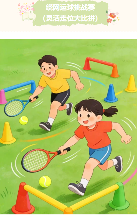 (1)亲子2人一组,家长先持拍,用球拍托球(或轻拍运球),沿锥桶S型路线绕桩,绕过球网后到达终点。
