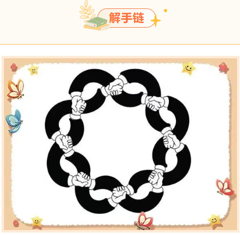 游戏玩法:团队成员站成一个向心圈, 每个人先举右手,握住对面那个人的手,再举起左手,握住除开自己相邻成员的手,然后在不松开手的情况下,想办法把这张乱网解开。