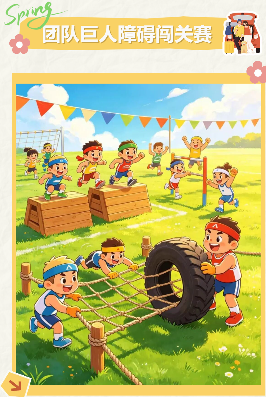 (2)赛道设置:赛道上设置多个关卡,比如跨栏、绕桩、平衡木、团队接力传递气球等。
